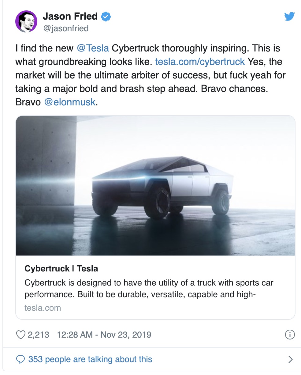 毫无疑问,也有和他有相同品味的人,尤其是加州的富豪们。对于赛博卡车(Cybertruck)的推出,各种科技公司的首席执行官和风险资本家给出了最积极的回应,这中间还包括科技投资者贾森•卡拉卡尼斯(Jason Calacanis)、Facebook的戴维•马库斯(David Marcus)和basecamp的首席执行官贾森•弗里德(Jason Fried)。这些人似乎是那种坐在赛博卡车里感觉很自在的人(而且很容易买得起)。坐在上面对他们来说是意见很“酷”的事情,就好像自己拥有了一个舰队一样。
