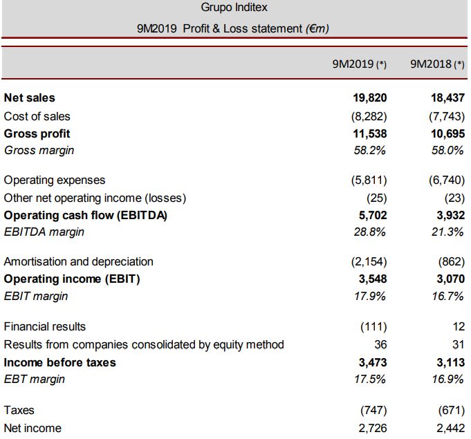 图为Inditex集团前三季度主要业绩数据,点击图片查看更清晰