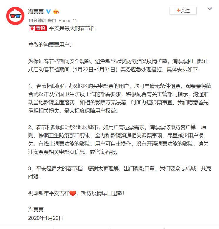 为确保新年档期间安全观影、防止新式冠状病毒肺炎疫情分散,淘票票即日起正式发动新年档期间(1月22日~1月31日)票务应急处理方法,具体安排如下: