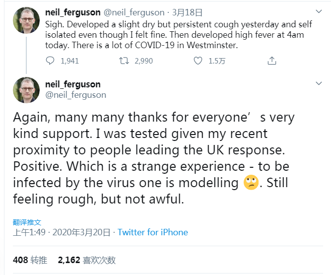 20日,伦敦帝国理工学院全球流行症剖析中心建模负责人、病毒学家尼尔·弗格森(Neil Ferguson)在推特上说:“再一次对各位的大力支持表明万分感谢。鉴于我最近与领导英国应对(疫情)的人密切触摸,我接受了新冠病毒检测。呈阳性。这是一种独特的体会——被自己建模研讨的病毒所感染。我仍感困难,但还不算糟糕。”