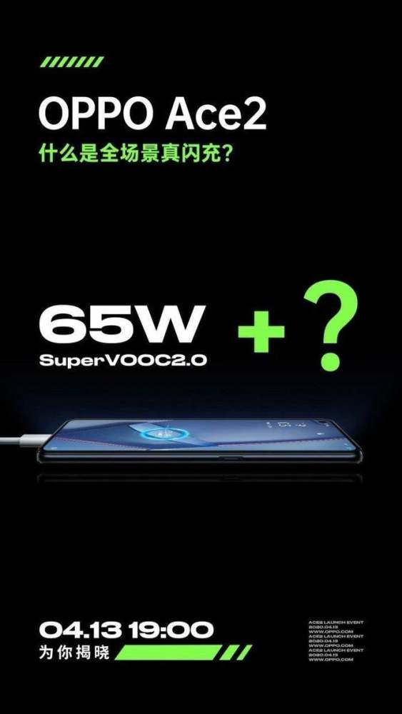 4月9日音讯,OPPO官方微博发文为行将到来的OPPO Ace2预热:65W超级闪充+____?怎样才是全场景真闪充?这或许预示着,4月13日发布的超级玩家Ace2或许会采纳65W超闪技能以及此前被曝光的OPPO无线充电技能。